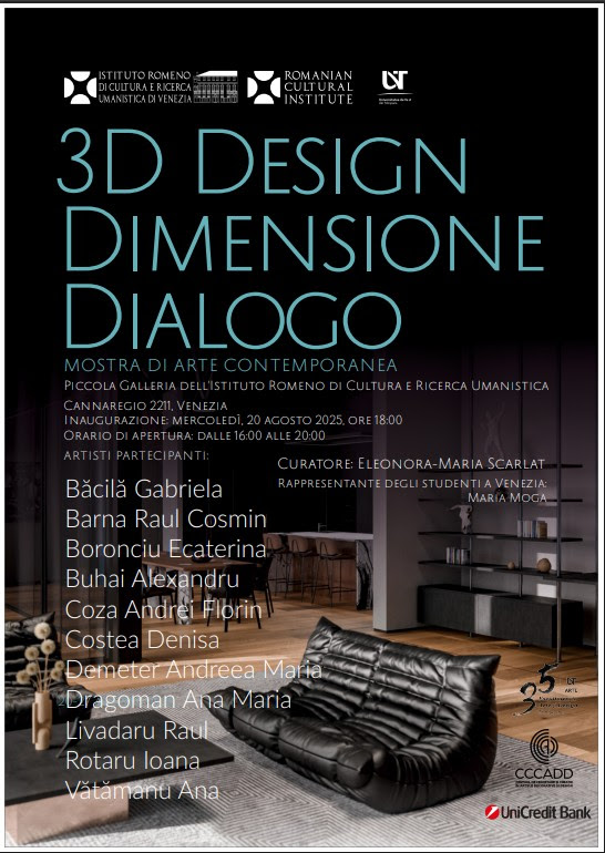 În perioada 20–27 august 2025, Institutul Român de Cultură și Cercetare Umanistică de la Veneția (ICR Veneția) a găzduit cea de-a patra ediție a proiectului „Anuala Venețiană”, o platformă dedicată promovării designului contemporan și a cercetării artistice emergente. Expoziția din acest an, intitulată „3D – Design, Dimension, Dialogue”, a reunit o selecție de lucrări ale […]