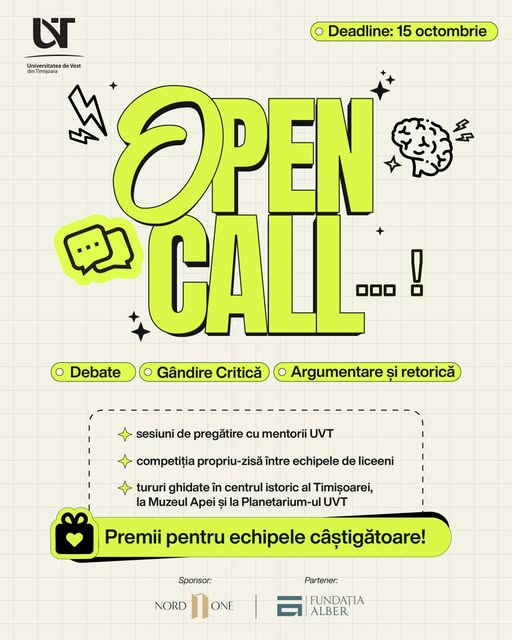 Universitatea de Vest din Timișoara lansează un concurs adresat liceelor din Timișoara și județul Timiș. Patru licee vor fi selectate și implicate activ în proiect, având șansa de a participa la o serie de ateliere interactive de gândire critică, argumentare și retorică, susținute de specialiști din UVT. Elevii selectați vor lucra alături de mentori pentru […]