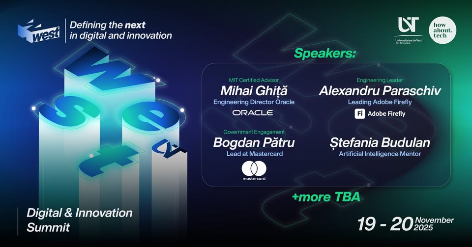 Tot ce știi despre tehnologie e pe cale să se schimbe, iar tu poți fi parte din conversația care definește viitorul în tech. La West Digital and Innovation Summit, liderii din digitalizare, inteligență artificială și tehnologie se reunesc pentru a explora tendințele care vor modela următorul deceniu. Pregătește-te să îi întâlnești pe cei care nu […]