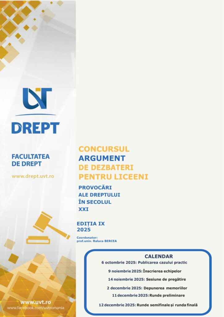 Facultatea de Drept a Universității de Vest din Timișoara (UVT) a organizat Concursul Național de Dezbateri „Argument – Provocări ale dreptului în secolul XXI”, ajuns la a noua ediție. Concursul a fost dedicat elevilor de liceu din clasele a XI-a și a XII-a și a avut ca scop familiarizarea lor cu tehnicile de documentare, de argumentare și de […]
