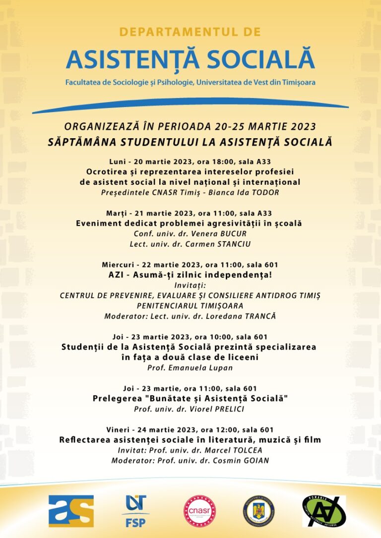 Departamentul de Asistență Socială din cadrul Facultății de Sociologie și Psihologie din Universitatea de Vest din Timișoara, în parteneriat cu Centrul de Prevenire, Evaluare și Consiliere Antidrog Timiș și Penitenciarul Timișoara au organizat miercuri, 22 martie 2023, cu ocazia Săptămânii Studentului la Asistență Socială o campanie de informare, conștientizare și educare a studenților de la specializarea asistență socială cu privire la problematica consumului și traficului de droguri.