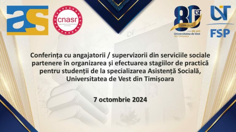 Departamentul de Asistență Socială din cadrul Facultății de Sociologie și Psihologie al UVT, în parteneriat cu Structura Timiș a Colegiului Național al Asistenților Sociali din România, a organizat, în 7 octombrie 2024, Conferința cu angajatorii / supervizorii din serviciile sociale partenere în organizarea și efectuarea stagiilor de practică pentru studenții de la specializarea Asistență Socială, Universitatea de Vest din Timișoara.