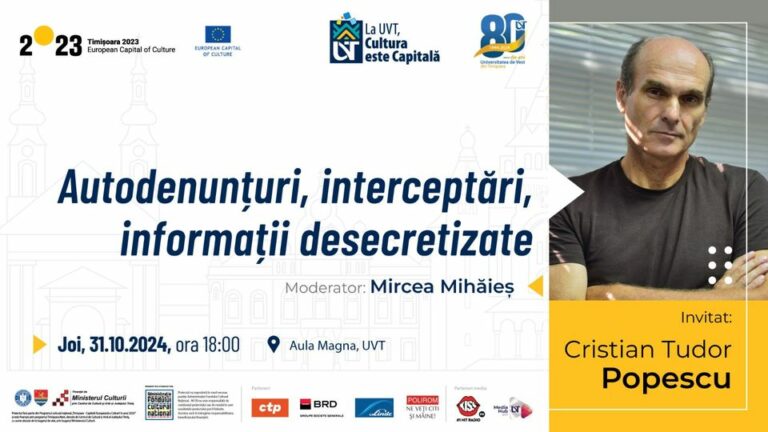 În data de 31 octombrie 2024, la Universitatea de Vest din Timișoara a avut loc conferința „Autodenunțuri, interceptări, informații desecretizate”, unde l-am avut ca invitat special pe unul dintre cei mai influenți gazetari și scriitori ai României, Cristian Tudor Popescu.