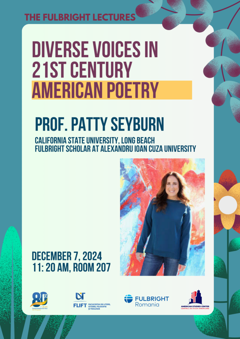 În data de 7 decembrie, ora 11:20, sala 207, Centrul de Studii Americane al Facultății de Litere, Istorie, Filosofie și Teologie a avut privilegiul de a o primi pe Patty Seyburn pentru a susține un curs dedicat poeziei americane contemporane pentru studenții de la Masteratul de Studii Americane. Patty Seyburn, profesoară la California State University din Long Beach, unde predă poezie și ateliere de Scriere Creativă, este și o poetă premiată, cu cinci volume publicate. Cel mai recent volum al invitatei este Threshold Delivery, publicat de Finishing Line Press în 2019. În acest an, Patty Seyburn activează ca lector Fulbright la Universitatea din Iași, unde predă cursuri de poezie americană. Cursul Diverse Voices in 21st Century American Poetry a reprezentat o oportunitate unică pentru studenții noștri, oferindu-le ocazia de a înțelege modul în care poeții din Statele Unite transformă tradițiile literare pentru a reflecta experiențe și teme contemporane.