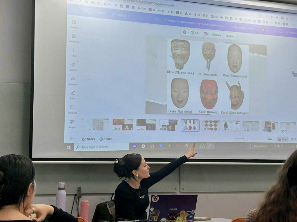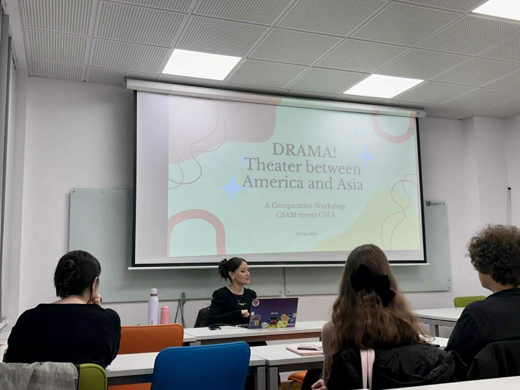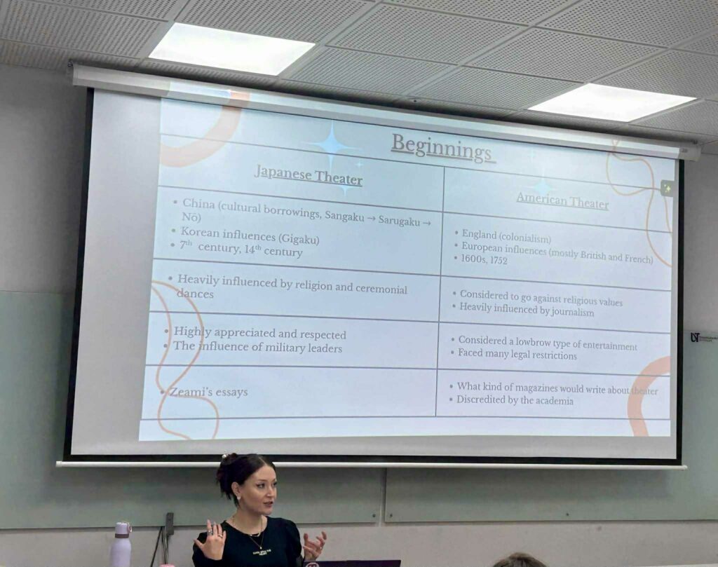 Pe data de 21 noiembrie 2025, ora 18, sala 330, Centrul de Studii Americane/ American Studies Center (https://csam-uvt.e-uvt.ro/) a găzduit un workshop comparativ despre teatrul american și teatrul japonez, la care invitați speciali au fost colegii și studenții de la Centrul de Studii Est-Asiatice (CSEA). Organizatoarea activității a fost Derya Alim, doctorandă și colaboratoare a Centrului de Studii Americane și cadru didactic asociat al programului de limba japoneză. Workshopul gândit drept spațiu al intersecțiilor creative a oferit un exemplu practic pentru modul în care Studiile Americane oferă o platformă de studiu și cercetare ce promovează perspective interdisciplinare și interculturale.