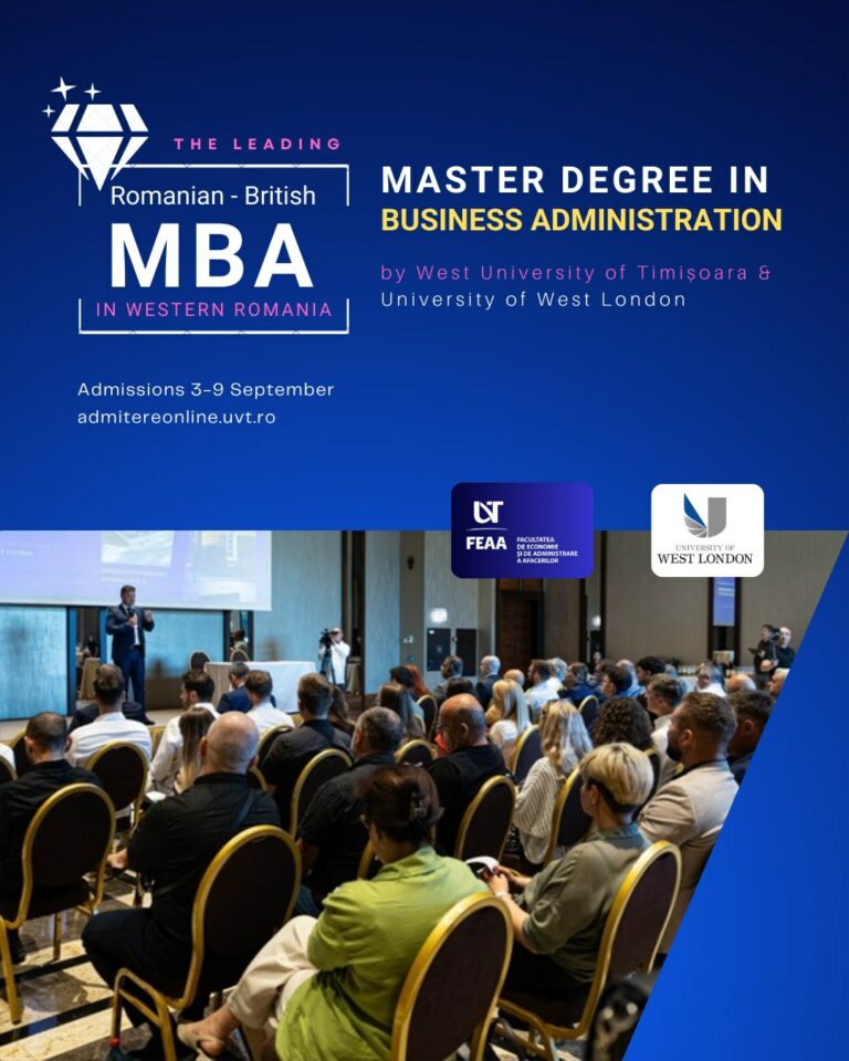 Facultatea de Economie și de Administrare a Afacerilor (FEAA) din cadrul Universității de Vest din Timișoara anunță finalizarea perioadei de înscriere pentru programul Master of Business Administration (MBA Româno-Britanic) în parteneriat cu University of West London.