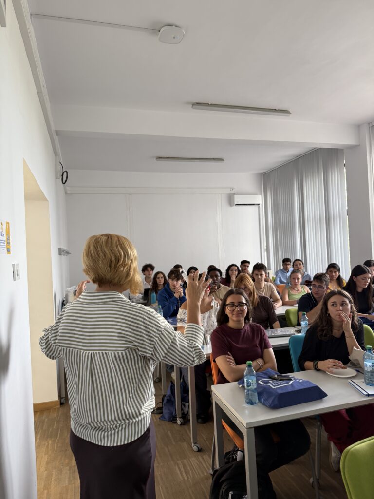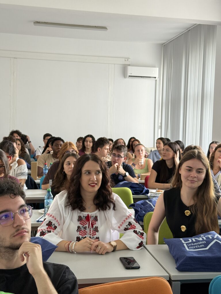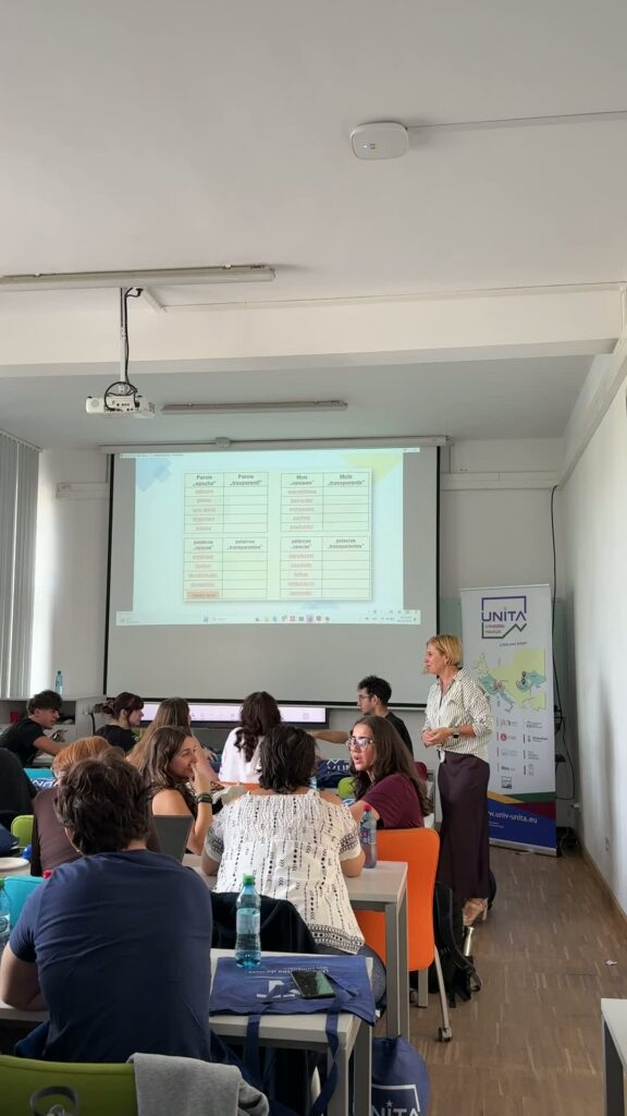 În perioada 22.09.2025-26.09.2025, la Universitatea de Vest din Timișoara s-au desfășurat trei sesiuni dedicate intercomprehensiunii în limbile romanice, susținute de conf. univ. dr. Ana-Maria Radu-Pop, cu un cuvânt de deschidere din partea doamnei conf. univ. dr. Valy Ceia, prorector al UVT. Activitățile s-au adresat atât studenților din anul I, în cadrul săptămânii de inițiere, cât și celor peste 50 de participanți la Adunarea Generală a UNITA Students Assembly, organizată la Timișoara.