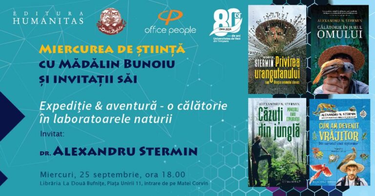 O nouă ediție a evenimentului „Miercurea de știință cu Mădălin Bunoiu și invitații săi” a avut loc miercuri, 25.09.2024, pe subiectul „Expediție și aventură – o călătorie în laboratoarele naturii”. Invitatul acestei întâlniri a fost îndrăgitul biolog și explorator Alexandru Stermin, care a purtat publicul în locuri îndepărtate și mai puțin cunoscute, dar extrem de interesante.