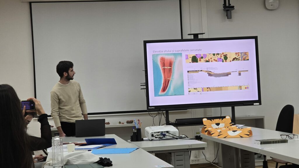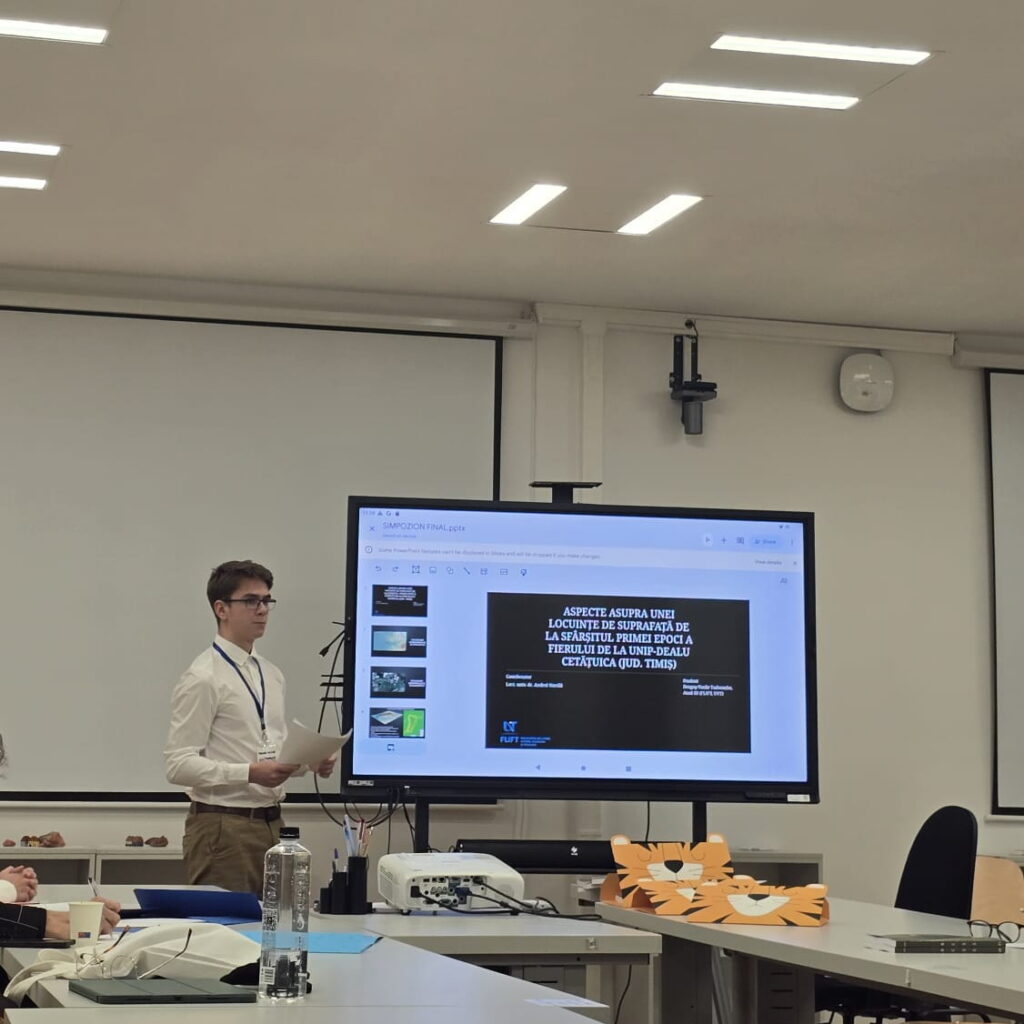 Dragoș-Vasile TUDORACHE, student în anul III, a prezentat o parte a rezultatelor campaniei arheologice din 2018 de la Unip-Dealu Cetățuica, unde au fost documentate resturile unei prime locuințe de suprafață datată la finalul primei epoci a fierului. Structura de tip platformă, cu elemente arhitecturale bine conservate, contribuie la completarea cunoștințelor despre un orizont cronologic încă puțin explorat, găsindu-şi analogii în situri precum Remetea Mare, Herneacova și Remetea Pogănici.