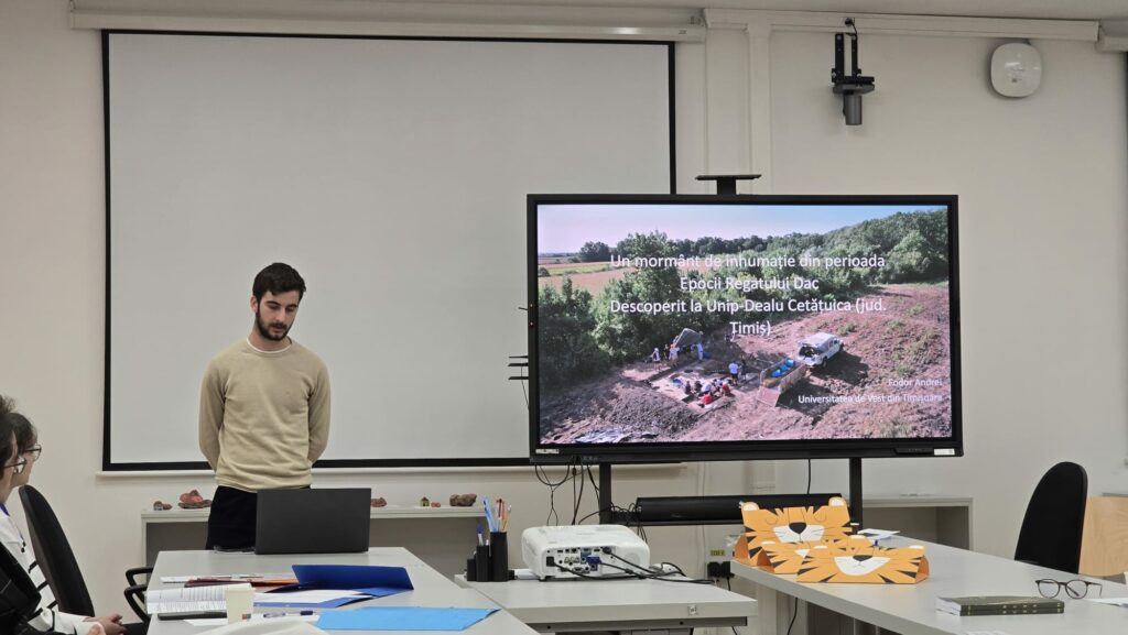 Andrei FODOR, student în anul III, a analizat prima descoperire funerară databilă în epoca clasică a civilizației dacice cercetată la Unip-Dealu Cetățuica, un reper inedit şi pentru arheologia întregului Banat. Lucrarea sa a integrat date arheologice de teren, analize antropologice, datări ¹⁴C și investigații izotopice de stronțiu, carbon și azot, conturând o imagine complexă asupra tratamentului post-mortem, a dietei, mobilității și încadrării cronologice absolute a defunctului.
