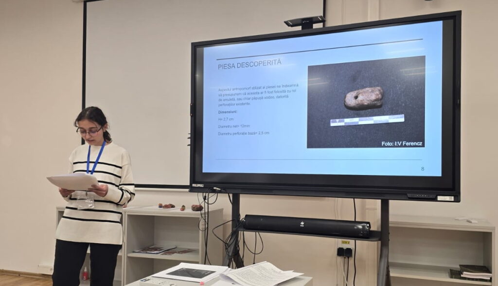 Ioana LUGOJAN, studentă în anul al III-lea, a adus în atenție o piesă inedită: o amuletă antropomorfă descoperită în 2013 în situl arheologic Ardeu–Cetățuie. Lucrarea a analizat semnificația magică a artefactului și a integrat analogii relevante cu descoperiri similare datate la sfârșitul epocii fierului. Studiul a evidențiat raritatea acestor piese în zona de sud-vest a Transilvaniei; totuși, pe baza bibliografiei de specialitate, a fost delimitată o posibilă arie de răspândire a acestui tip de artefact, întrucât în zona Europei de Est astfel de descoperiri sunt mult mai numeroase.