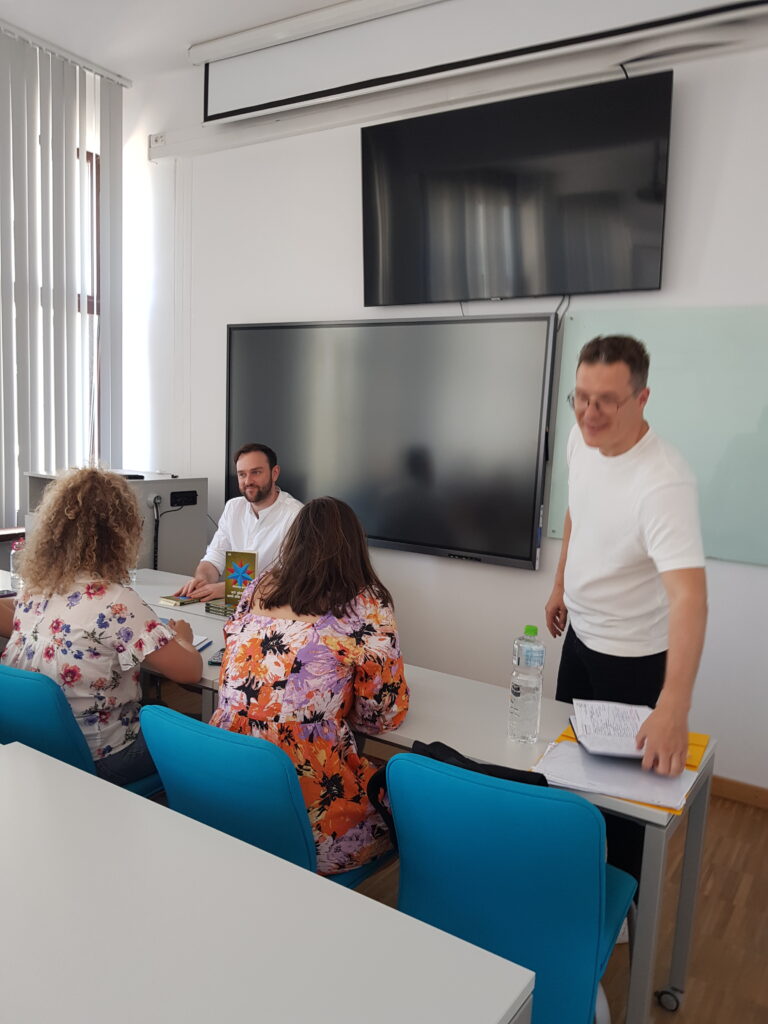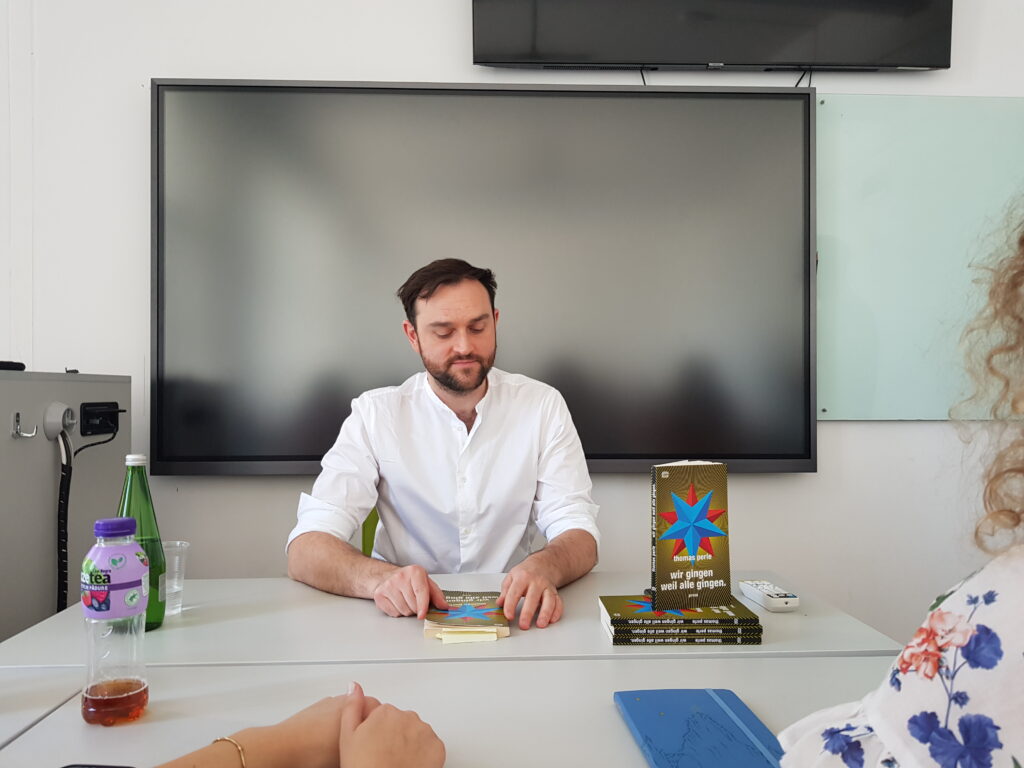 Lectura a fost urmată de o conversație între autor și public despre experiențele străinătății și ale înstrăinării, începând cu întrebarea adresată de către autor studenților anilor I și II de masterat și ai anului II de licență, dacă ar studia germana pentru a merge în Germania.