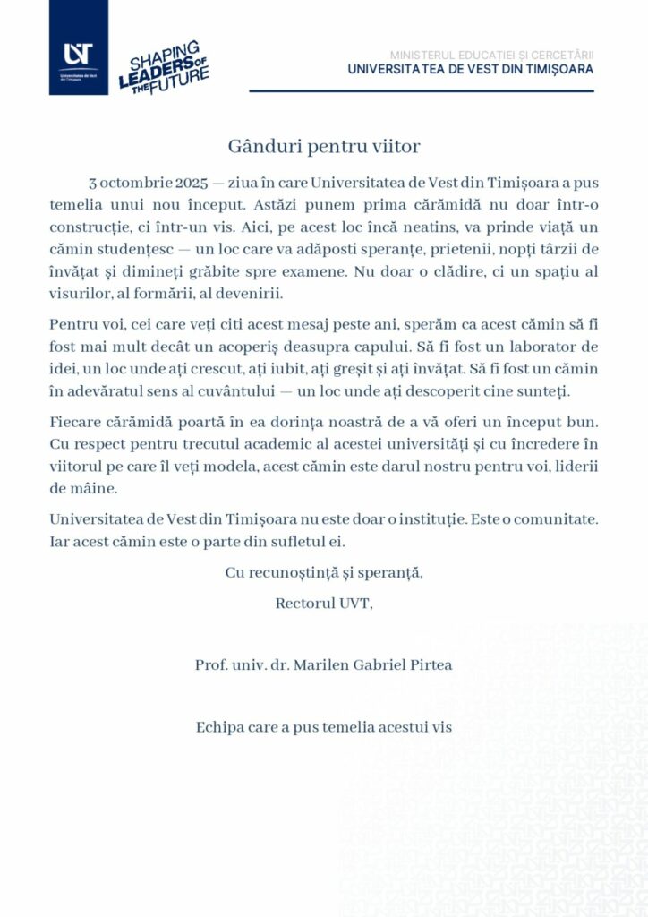 3 octombrie 2025 — ziua în care Universitatea de Vest din Timișoara a pus temelia unui nou început. Astăzi punem prima cărămidă nu doar într-o construcție, ci într-un vis. Aici, pe acest loc încă neatins, va prinde viață un cămin studențesc — un loc care va adăposti speranțe, prietenii, nopți târzii de învățat și dimineți grăbite spre examene. Nu doar o clădire, ci un spațiu al visurilor, al formării, al devenirii.