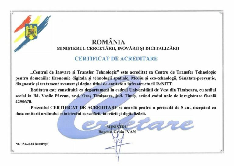 Universitatea de Vest din Timișoara are plăcerea de a anunța obținerea certificatului de acreditare nr. 152/2024, împreună cu ordinul nr. 20616 privind acreditarea și acordarea titlului de entitate a infrastructurii ReNITT pentru „Centrul de Inovare și Transfer Tehnologic” constituit în cadrul Universității de Vest din Timișoara, consolidând astfel angajamentul instituției față de promovarea inovației și a transferului tehnologic.