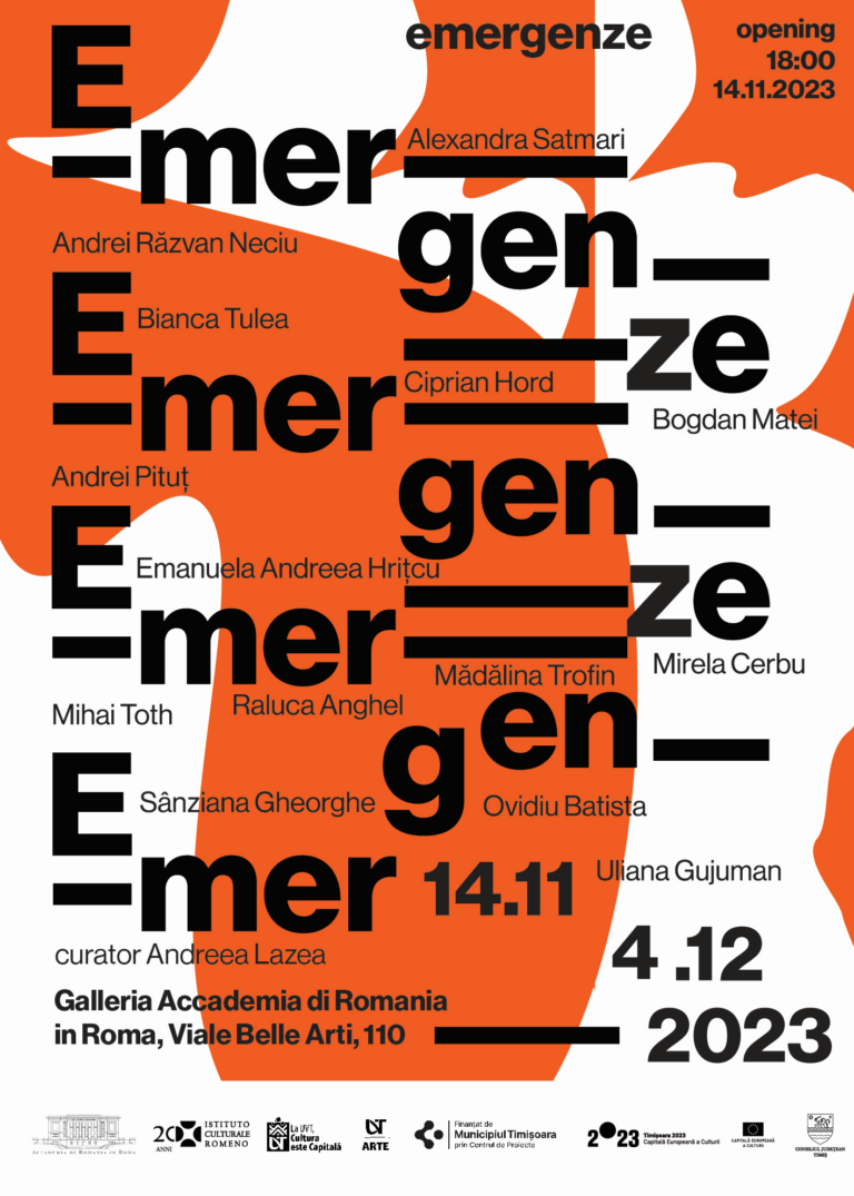 Accademia di Romania din Roma cu sprijinul Ambasadei României în Republica Italiană, în parteneriat cu Universitatea de Vest din Timișoara, au organizat, în data de 14 noiembrie, vernisajul expoziției „Emergenze”, un eveniment care marchează douăzeci de ani de la înființarea Școlii doctorale în Arte în cadrul Universității de Vest din Timișoara.