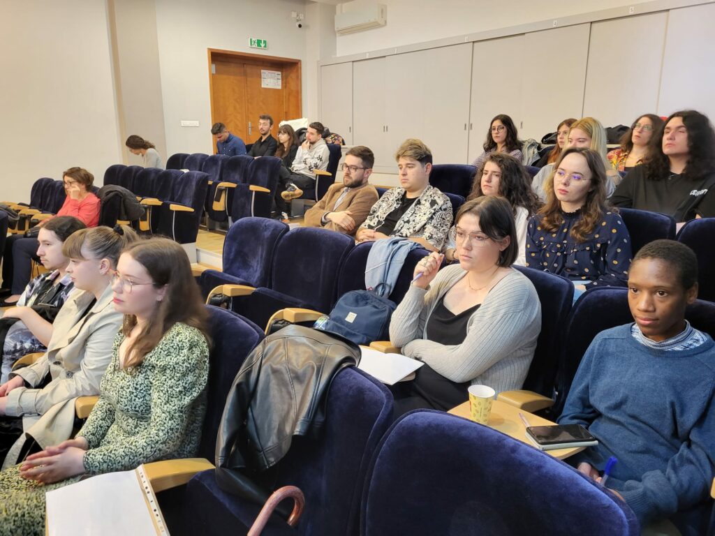 Sesiunea de încheiere a simpozionului, moderată de Conf. univ. dr. Luminița Frențiu și Conf. univ. dr. Eliza Filimon, a facilitat dialogul dintre studenți și cadre didactice pe teme de actualitate privind formarea profesională a traducătorilor în universități, provocarile aduse de dezvoltarea inteligenței artificiale și utilitetea instrumentelor unitare de evaluare în domeniul traducerii audiovizuale.