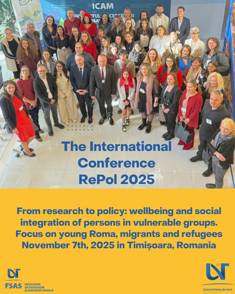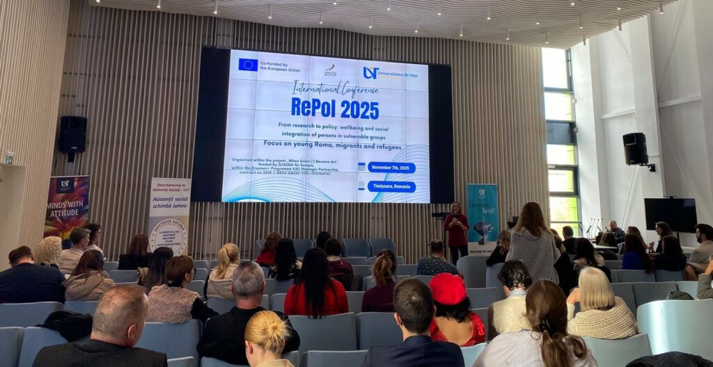 Pe 7 noiembrie 2025, la Universitatea de Vest din Timișoara (UVT), a avut loc Conferința Internațională „RePol 2025 – From Research to Policy: Wellbeing and Social Integration of Persons in Vulnerable Groups”, un eveniment științific care a reunit peste 60 de cercetători, experți, cadre didactice, studenți (nivel licență, masterat și doctorat), reprezentanți ai societății civile și factori de decizie din șapte țări: România, Germania, Grecia, Italia, Macedonia de Nord, Serbia și Turcia. Evenimentul a fost organizat de Universitatea de Vest din Timișoara în cadrul proiectului european „When Scars (!) Become Art”, finanțat prin programul Erasmus+, acțiunea KA2 – Parteneriate Strategice (contract nr. 2023-1-DE04-KA220-YOU-000166967).