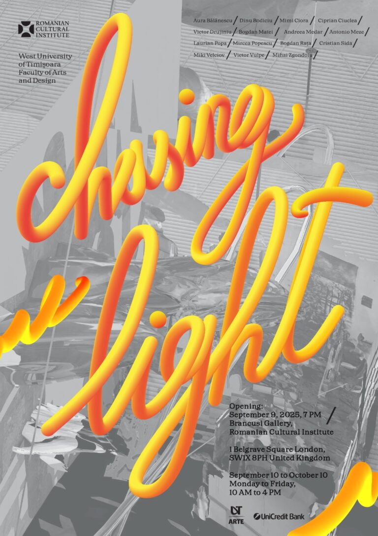 Expoziția “Chasing Light”, curatoriată de artiștii Mihai Zgondoiu și Bogdan Rață, reunește peste 30 lucrări de desen, pictură, sculptură, obiecte de design, fotografie, benzi desenate și artă video, realizate de absolvenți ai FAD UVT. Vernisajul va avea loc la Galeria „Constantin Brâncuși” a ICR Londra, în data de 9 septembrie 2025, de la ora 19:00, în prezența decanei FAD UVT, prof.univ.dr. Diana Andreescu și a celor doi curatori. Publicul larg va fi invitat să viziteze expoziția până la data de 10 octombrie, de luni până vineri, între orele 10:00 – 16:00.