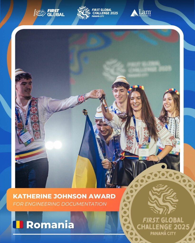 Echipa de robotică Team Romania a obținut medalia de aur „Katherine Johnson Award for Engineering Documentation” la competiția internațională FIRST Global Challenge 2025, desfășurată la Panama City.