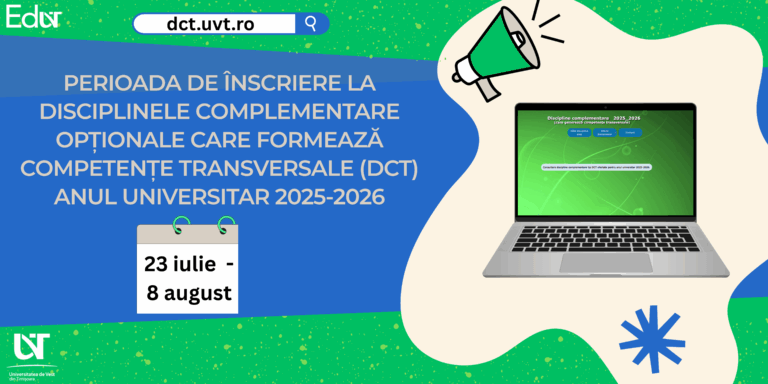 În perioada 23 iulie – 8 august 2025 studenții au ocazia să opteze pentru disciplinele complementare care formează competențe transversale pe care le vor studia în anul universitar 2025-2026, accesând site-ul www.dct.uvt.ro, după cum urmează: