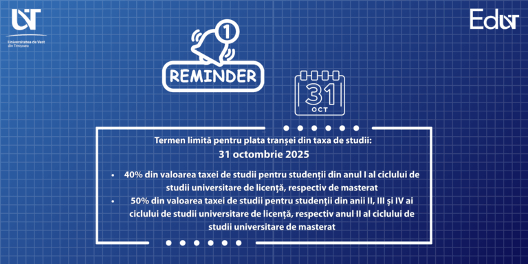 Astfel, toți studenții înmatriculați pe un loc cu taxă trebuie să achite până cel târziu la data de 31 octombrie 2025 prima sau a doua tranșă din taxa de studii (în funcție de anul de studii), în cazul în care nu au achitat-o deja.