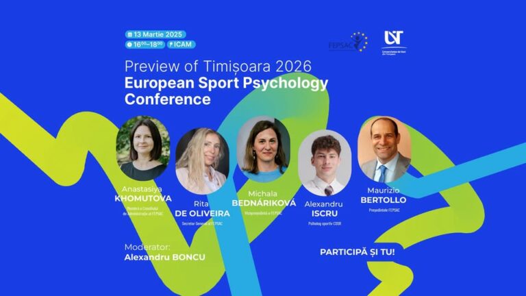 În drumul către 𝐂𝐨𝐧𝐟𝐞𝐫𝐢𝐧𝐭̦𝐚 𝐄𝐮𝐫𝐨𝐩𝐞𝐚𝐧𝐚̆ 𝐝𝐞 𝐏𝐬𝐢𝐡𝐨𝐥𝐨𝐠𝐢𝐞 𝐒𝐩𝐨𝐫𝐭𝐢𝐯𝐚̆ 𝐅𝐄𝐏𝐒𝐀𝐂 𝟐𝟎𝟐𝟔, publicul interesat a fost invitat să participe la un eveniment de tip preview dedicat explorării celor mai actuale teme din domeniul psihologiei sportului!