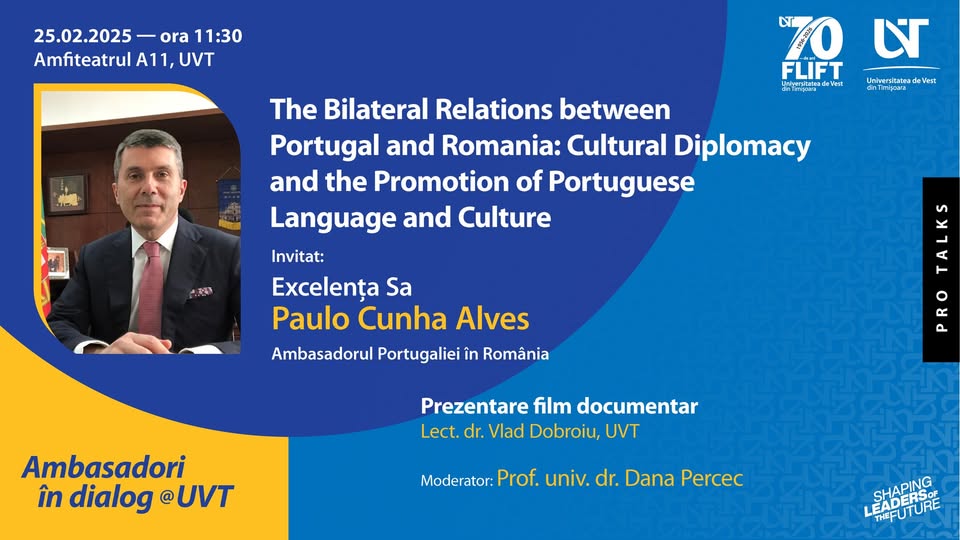 Ambasadori în dialog@UVT: Excelența Sa Paulo Cunha Alves, Ambasadorul Portugaliei în România, într-un dialog pe tema „Relațiile bilaterale dintre Portugalia și România. Diplomația culturală prin promovarea limbii și culturii portugheze”