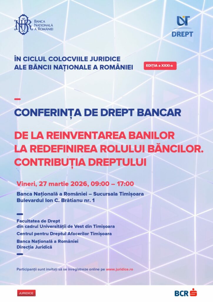 Conferinței de Drept Bancar de la Timișoara, cu tema „De la reinventarea banilor la redefinirea rolului băncilor. Contribuția dreptului” a avut loc în data de 27 martie 2026, la Banca Națională a României – Sucursala Timișoara, fiind transmisă online pe pagina juridice.ro și social-media. Conferința face parte din prestigiosul ciclu „Colocviile juridice ale Băncii Naționale a României”, ajuns la […]
