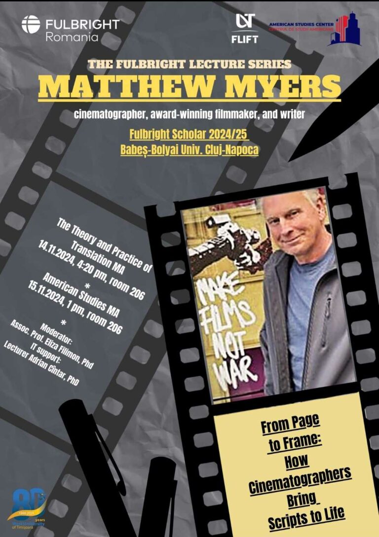 Pe 14-15 noiembrie 2024, în deja consacrata serie The Fulbright Lectures, Centrul de Studii Americane al Universității de Vest din Timișoara a avut onoarea de a-l avea ca invitat pe Matthew Myers, Profesor Fulbright 2024/2025 la Universitatea Babeș-Bolyai din Cluj-Napoca. Regizor multipremiat, cu o vastă experiență ca director de imagine, expert în domeniul filmelor documentare, televiziunii și publicității, acesta s-a adresat atât masteranzilor din cadrul programelor de Studii Americane și Teoria și Practica Traducerii, cât și doctoranzilor implicați în domenii conexe temelor de discuție propuse.