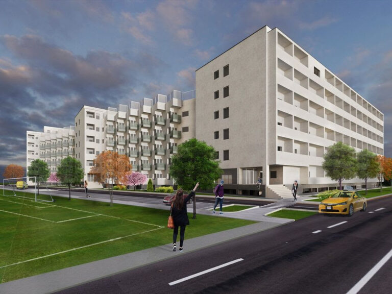 *Imagini cu schițele randărilor spațiilor exterioare și interioare ale viitorului cămin studențesc.