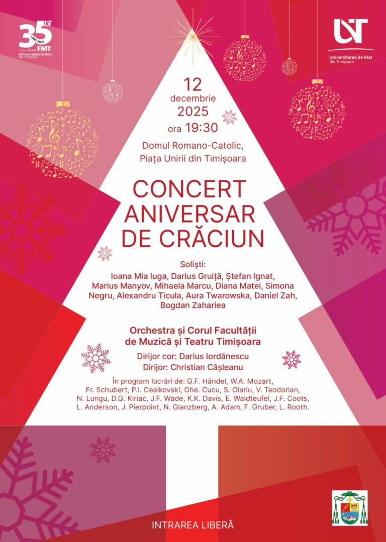 Universitatea de Vest din Timișoara, Facultatea de Muzică și Teatru, vă invită la Concertul Aniversar de Crăciun cu ocazia celebrării celor 35 de ani de excelență artistică, vineri, 12 decembrie, ora 19:30, la Domul Romano-Catolic din Timișoara.