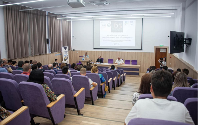 În data de 31 mai 2024, Amfiteatrul A11 al Universității de Vest din Timișoara a găzduit Conferința aniversară sub genericul 65 de ani de geografie la Universitatea de Vest din Timișoara – Excelență, Viziune și Profesionalism în Educația și Cercetarea Geografică. Evenimentul a celebrat cei 65 de ani de existență a geografiei în cadrul universității și alături de sesiunea aniversară, manifestarea a fost dedicată și lucrărilor științifice. Conferința a debutat cu un cuvânt de bun venit și alocuțiuni la ceas aniversar din partea conducerii Universității de Vest din Timișoara și, respectiv, a Facultății de Chimie, Biologie, Geografie reprezentate prin Doamna Prorector Prof. univ. Dr. Flavia Barna și Prof. univ. Dr. Habil. Nicoleta Ianovici, la care s-a alăturat din partea Academiei Române domnul Academician prof. Dr. Dan Bălteanu. Alocuțiunile aniversare au continuat prin cuvântul invitaților din toate centrele universitare București, Cluj Napoca, Craiova, Constanța, Iași și Oradea pentru ca în partea a doua trei comunicări în plen să rețină atenția audienței în mod deosebit prin participarea unor cercetători de mare prestigiu din străinătate și din țară. Conferința a continuat cu comunicări pe secțiuni în cadrul a a6 sesiuni de lucru însumând peste 30 de comunicări susținute de cadre didactice și cercetători din țară și din cadrul departamentului, de doctoranzi, masteranzi și studenți, care și-au expus cele mai recente și interesante rezultate ale cercetărilor realizate în ultimul timp. De asemenea, amintim prezența cadrelor didactice din sistemul preuniversitar de învățământ, care, cu pasiune, au prezentat cele mai interesante experiențe metodice și didactice din munca cu elevii în contextul învățării de calitate a geografiei. Evenimentul a fost excelent coordonat și organizat de Lect. univ. Dr. Sorin Pavel și Lect. univ. Dr. Ioan Sebastian Jucu alături de Lect. univ. Dr. Ana Ianăș, Lect. univ. Dr. Ramona Ivan, Asist. Univ. Dr. Alexandra Marian-Potra, Asist. Univ. Dr. Fabian Timofte, Lect. univ. Dr. Ionuț Zisu și Drd. Vlad Cumpănaș. Semnalăm și salutăm implicarea activă a studenților Departamentului de Geografie. Evenimentul aniversar și științific s-a bucurat de un succes deosebit ilustrând încă o dată dezvoltarea continuă a Geografiei timișorene sub semnul excelenței și profesionalismului academic. La Mulți Ani Geografiei timișorene la aniversarea a 65 de ani de existență în contextul celebrării UVT 80. La Mulți Ani UVT.