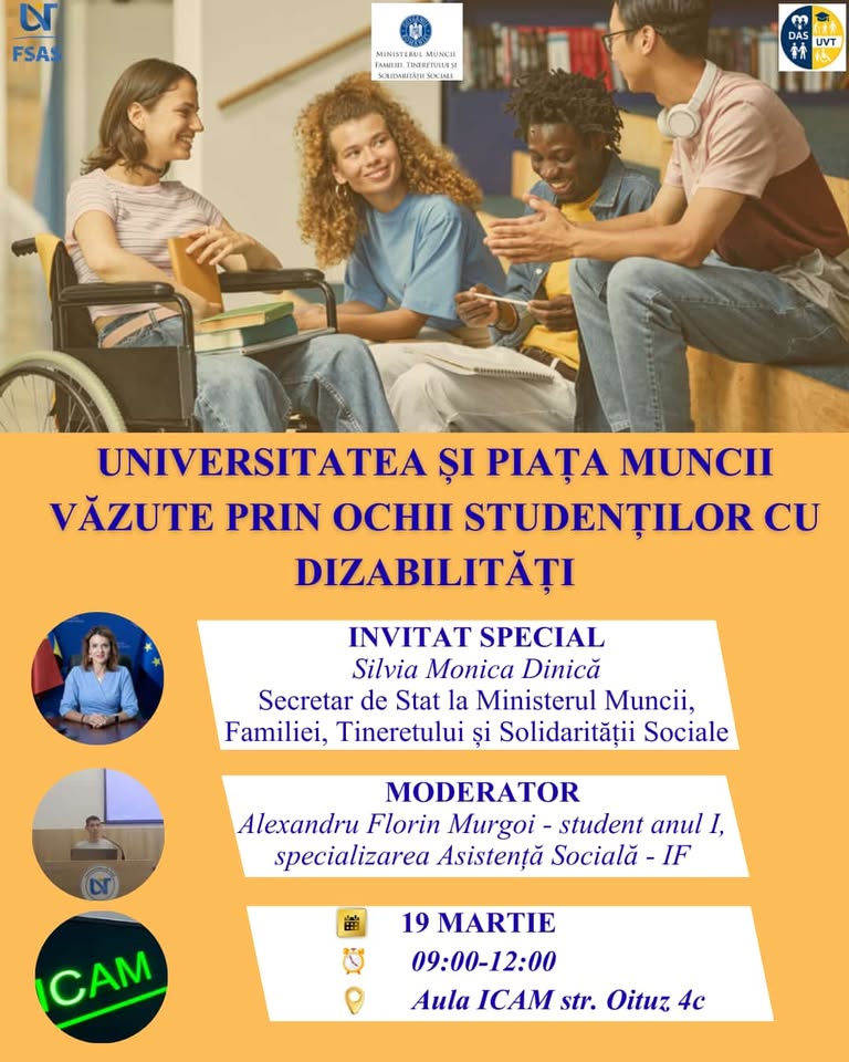 Facultatea de Sociologie și Asistență Socială din cadrul Universității de Vest din Timișoara (UVT) a organizat joi, 19 martie, începând de la ora 9, în Aula ICAM (Oituz 4c) evenimentul cu titlul: „De la acces la incluziune: universitatea și piața muncii văzute prin ochii studenților cu dizabilități”, dedicat dialogului aplicat privind incluziunea în mediul universitar și integrarea profesională a persoanelor cu dizabilități.