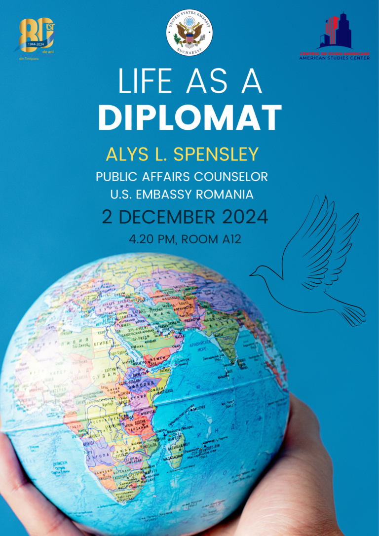 Pe data de 2 decembrie 2024, Centrul de Studii Americane al Facultății de Litere, Istorie, Filosofie și Teologie al Universității de Vest din Timișoara a avut onoarea de a găzdui vizita unui înalt reprezentant al Ambasadei SUA în România, Alys L. Spensley, Public Affairs Counselor. În cadrul cursului Media Discourses in the U.S. and the U.K. al Conf. Dr. Irina Diana Mădroane, Alumn Fulbright și membru activ al Centrului de Studii Americane, discuția propusă a pornit de la tema Life as a Diplomat (Viața unui diplomat). Decanul Facultății, Prof. Dr. Habil. Dana Percec, și Directorul CSAM, Prof. Dr. Habil. Cristina Chevereșan, au prefațat întâlnirea organizată în Amfiteatrul A12, în format hibrid, cu un cuvânt introductiv, respectiv o prezentare a invitatei, adresate atât celor prezenți în sală, cât și numeroșilor colegi din online. Cursanților li s-au alăturat masteranzi, doctoranzi și membri ai echipei de profesori și cercetători în Studii Americane.