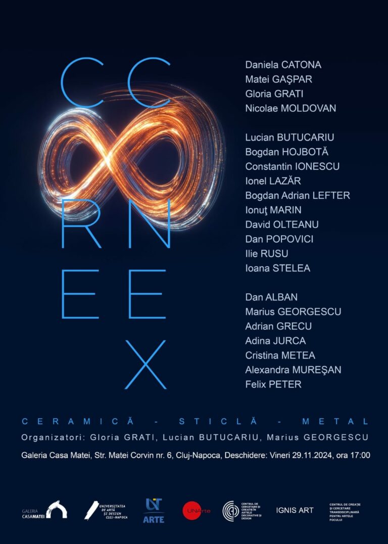 Vernisajul expoziției CORE-CONEX a avut loc în 29 noiembrie 2024, în Galeria Casa Matei din Cluj-Napoca organizat de Departamentul Ceramică-Sticlă-Metal al Universității de Artă și Design din Cluj-Napoca în parteneriat cu Specializarea Ceramică-Arte Decorative a Facultății de Arte și Design din cadrul Universității de Vest Timișoara și cu Departamentul Ceramică – Sticlă – Metal al Universității Naționale de Artă București. Creațiile personale ale cadrelor didactice din cele trei centre universitare de artă, au alcătuit o expoziție unitară, astfel au expus următorii artiști precum: