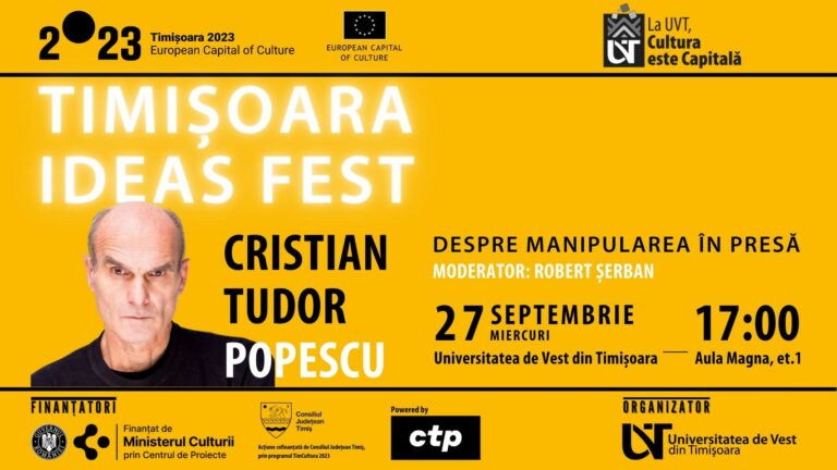 Timișoara Ideas Fest a adus o conferință spectaculoasă, chiar în timpul Săptămânii de Inițiere la UVT! Miercuri, 27 septembrie, începând cu ora 17:00, în Aula Magna UVT, Cristian Tudor Popescu s-a întâlnit cu tinerii din Timișoara pentru un dialog captivant, „Despre manipularea în presă”.