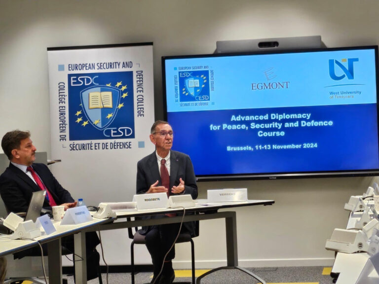 În perioada 11-13 noiembrie 2024 s-a desfășurat la Bruxelles a treia ediție a cursului de formare de competențe avansate in diplomație si securitate, “Advanced Diplomacy for Peace, Security and Defence”, organizat de Universitatea de Vest din Timișoara în colaborare cu EGMONT – Institutul Regal pentru Relații Internaționale al Belgiei, sub egida Colegiului European de Securitate și Apărare al Uniunii Europene.