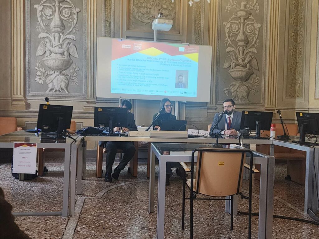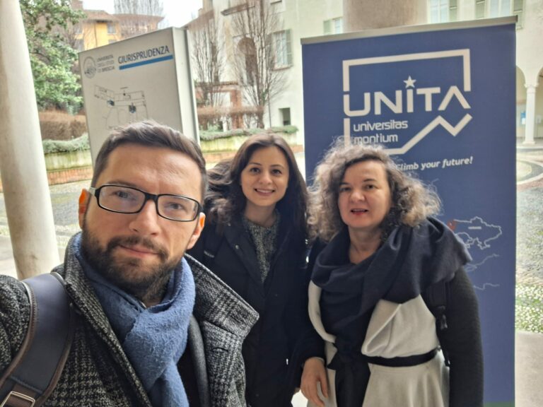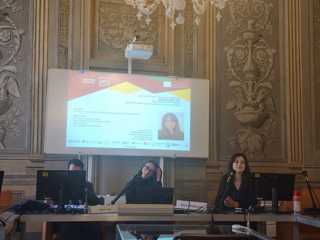 Deplasarea echipei UVT alcătuită din Anatolie Coșciug (de la Institutul de Cercetări Avansate de Mediu), Arleen Ionescu (de la Facultatea de Litere, Istorie, Filosofie și Teologie), Marius Mitrache (de la Facultatea de Științe ale Guvernării și Comunicării) și Bianca Șerb (de la Facultatea de Drept), la Universitatea din Brescia în perioada 16 – 18 februarie 2026 a inclus două evenimente organizate de UNITA: Conferința internațională “European Citizenship at a Crossroads. Fundamental Rights between Complexity and Transdisciplinarity” și un Matching event “Fundamental Rights and European Citizenship.” Organizarea colegilor noștri din Brescia a fost de calitate maximă, iar discuțiile avute cu toți colegii din UNITA au fost extrem de fructuoase. Conferința din 16 februarie a adunat contribuții ale mai multor colegi de la Universitatea din Brescia, Universitatea din Torino, Instituto Politécnico da Guarda Escola Superior de Educação Comunicação e Desporto din Portugalia, Universidad Pública de Navarra din Spania. Temele și ariile de expertiză ale colegilor noștri au fost variate, iar discuțiile care au însoțit plenarele acestor colegi s-au marcat prin interdisciplinaritate. Participanții au învățat unii de la alții despre diverse politici ale Uniunii Europene, despre drepturile cetățenilor europeni, discriminare, politici publice în Uniunea Europeană privind hrana, mediul, probleme de sănătate publică, religie, etc.