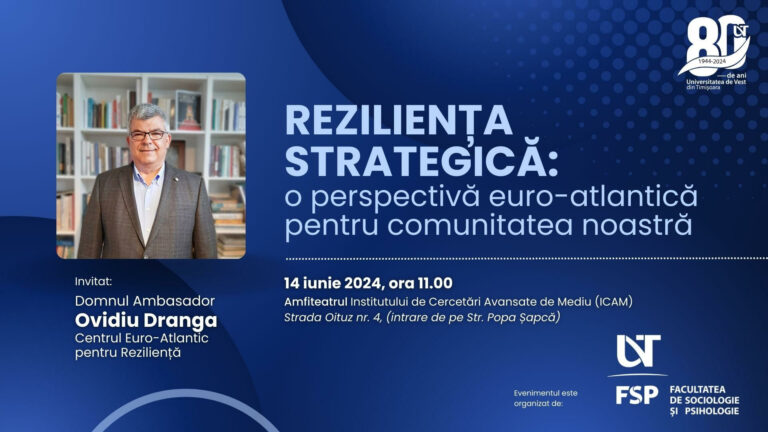 Facultatea de Sociologie și Psihologie are deosebita plăcere de a adresa comunității UVT invitația de a participa la conferința cu tema „Reziliența strategică: o perspectivă euro-atlantică pentru comunitatea noastră” susținută de dl. Ovidiu Dranga, fost ambasador al României în Japonia, în prezent expert la Centrul Euro-Atlantic pentru Reziliență.