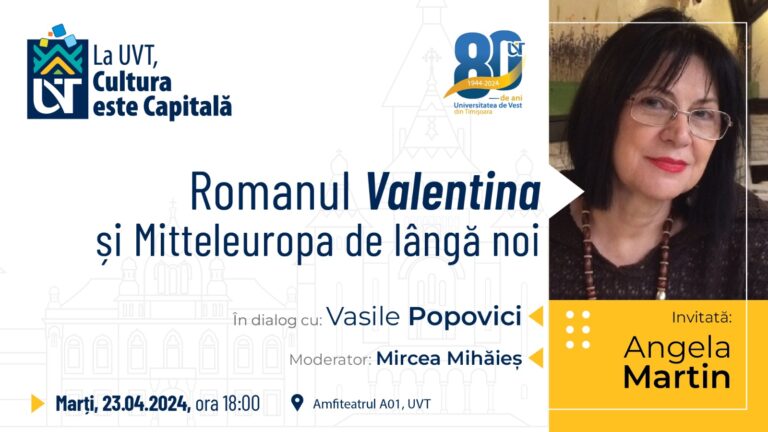 Un nou eveniment din seria „La UVT, Cultura este Capitală!” a avut loc la Universitatea de Vest din Timișoara, de data aceasta un dialog între Angela Martin și Vasile Popovici, cărora li s-a alăturat dl. Mircea Mihăieș, moderatorul discuției.