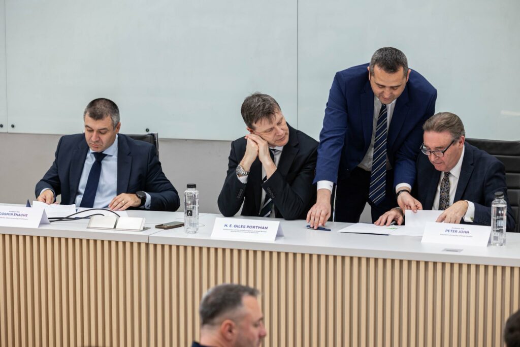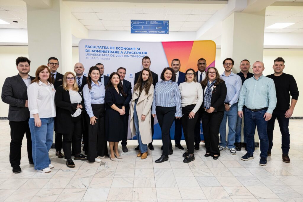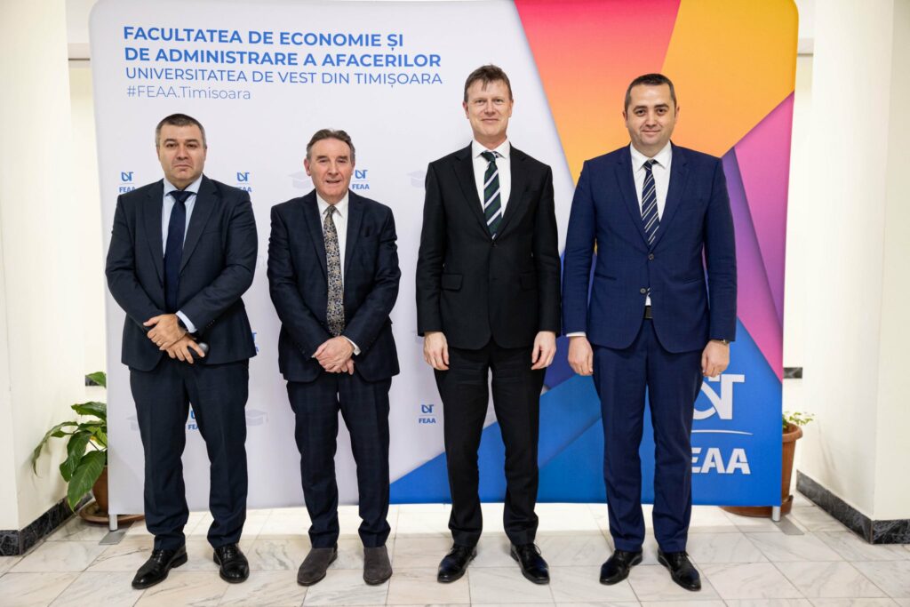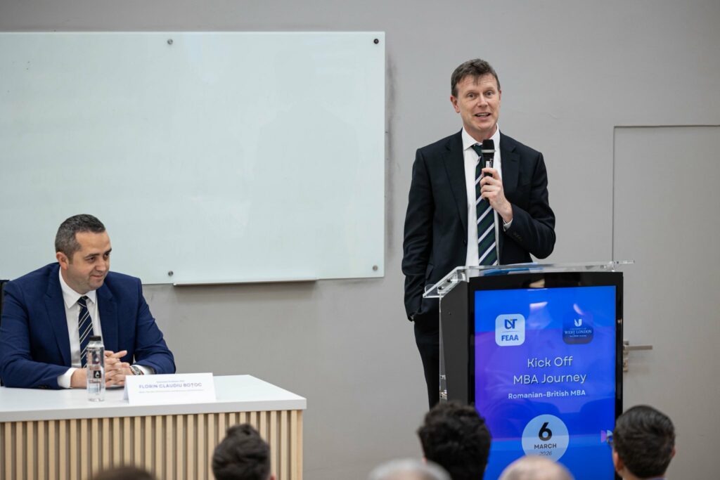 Facultatea de Economie și de Administrarea a Afacerilor (FEAA) din cadrul Universității de Vest din Timișoara a organizat vineri, 6 martie 2026, în amfiteatrul din sediul principal FEAA (str. J.H.Pestalozzi, nr. 16, Timișoara), evenimentul prilejuit de vizita la UVT a Excelenței Sale, ambasadorul Regatului Unit al Marii Britanii şi Irlandei de Nord în România, domnul Giles Portman. Cu această ocazie a avut loc întâlnirea de etapă cu echipa academică și studenții noului program MBA (Masterat în Administrarea Afacerilor), organizat în cadrul parteneriatului dintre Universitatea de Vest din Timișoara (UVT) și University of West London (UWL).