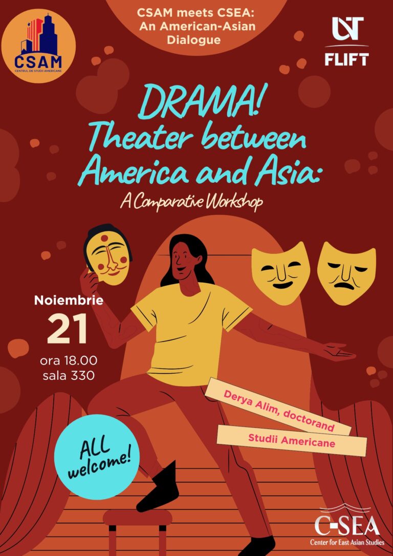 Pe data de 21 noiembrie 2025, ora 18, sala 330, Centrul de Studii Americane/ American Studies Center (https://csam-uvt.e-uvt.ro/) a găzduit un workshop comparativ despre teatrul american și teatrul japonez, la care invitați speciali au fost colegii și studenții de la Centrul de Studii Est-Asiatice (CSEA). Organizatoarea activității a fost Derya Alim, doctorandă și colaboratoare a Centrului de Studii Americane și cadru didactic asociat al programului de limba japoneză. Workshopul gândit drept spațiu al intersecțiilor creative a oferit un exemplu practic pentru modul în care Studiile Americane oferă o platformă de studiu și cercetare ce promovează perspective interdisciplinare și interculturale.