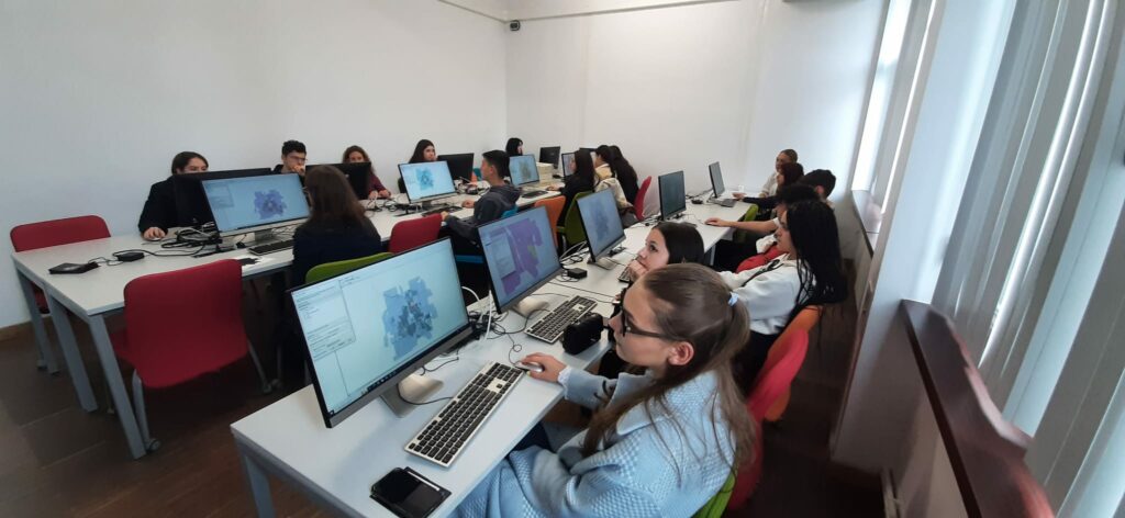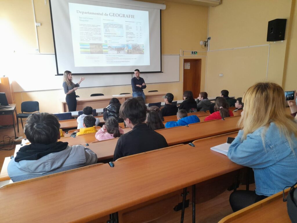 Săptămâna cuprinsă între 24 și 28 Aprilie a prilejuit numeroase vizite ale elevilor în cadrul Departamentului de Geografie al facultății de Chimie, Biologie, Geografie UVT. Aceștia au avut prilejul de a vizita laboratoarele de studiu și spațiile de învățământ ale departamentului fiind interesați de cele mai noi abordări ale geografiei și geografiilor actuale, intrând în contact cu teme de laborator deosebit de interesante și atractive. Activitatea a fost coordonată de către Asist. Dr. Marian-Potra Alexandra, care a prezentat programele de studii și oportunitățile acestora, desfășurând totodată o serie de activități din domeniul cartografiei și al geografiei umane. Alături de dumneaei, au fost realizate activități specifice din domeniul geografiei fizice și al geografiei așezărilor de către Prof. Dr. Petru Urdea, Asist. Dr. Fabian Timofte, Asist. Dr. Patrick Chiroiu, Lect. Dr. Alina Satmari, Lect. Dr. Ionuț Zisu și Drd. Vlad Cumpănaș. Dintre școlile participante menționăm Colegiul Național J. L. Calderon, Liceul Grigore Moisil, Școala gimnazială nr. 4 din Timișoara și Școala din Beregsăul Mare. Elevii s-au dovedit a fi deosebit de interesați atât de geografie, cât și de mediul inedit descoperit în cadrul Universității de vest din Timișoara și avem certitudinea că aceste vizite, cu siguranță îi vor inspira în conturarea proiecție a viitoarelor profesii prin intermediul studiului programelor de studii ofertate atât de Departamentul de Geografie, cât și de Universitatea de Vest din Timișoara.