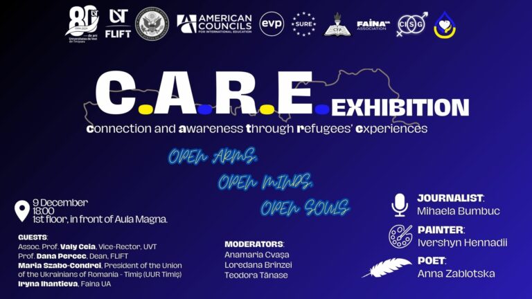 Între 9 și 13 decembrie 2024, în holul din fața Aulei Magna, profesorii, cercetătorii și studenții din comunitatea UVT au avut șansa să îi cunoască pe membrii comunității ucrainene din Timișoara prin intermediul poveștilor despre experiența lor de refugiați, pe care le-au împărtășit echipei de proiect SURE: Students for a United and Resilient Europe, și, mai ales, prin creațiile lor artistice și exponate despre cultura ucraineană (poezii, reportaje, picturi, prezentări ale personalităților ucrainene), pentru care le mulțumim reprezentanților asociației Faina UA și ai Uniunii Ucrainenilor din România, Filiala Timiș. Realizatorii expoziției din cadrul campaniei C.A.R.E. („Connection and Awarness through Refugees’ Experiences”) și-au propus astfel să combată, prin empatia trezită de artă, dezinformarea și narațiunile false care circulă despre refugiații ucraineni în spațiul public românesc.