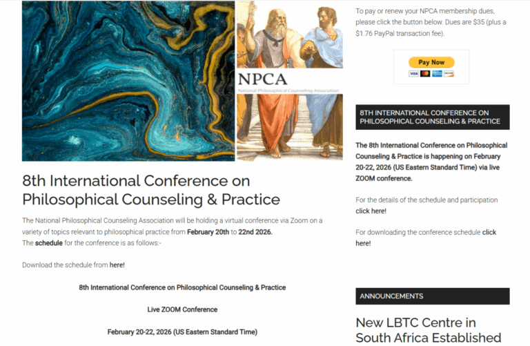 National Philosophical Counseling Association – SUA a organizat cea de-a VIII-a Conferință Internațională de Consiliere și Practică Filosofică în perioada 20-22 februarie 2026. Conferința, desfășurată online, a găzduit peste 40 de vorbitori din întreaga lume, inclusiv din Statele Unite, Italia, România, Croația, Israel, Finlanda, Serbia, China, India, Ungaria, Germania, Rusia, Turcia, Spania și Mexic. Aceasta a fost cea mai numeroasă participare din istoria conferinței.