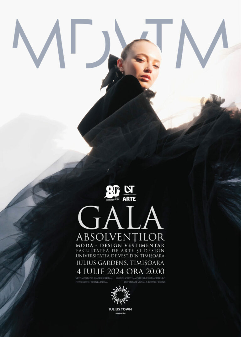 Facultatea de Arte și Design (FAD) din cadrul Universității de Vest din Timișoara, prin programul de studiu Modă – Design Vestimentar, are plăcerea de a vă invita la Gala MDVTM 2024, care va avea loc joi, 4 iulie 2024, la Iulius Garden (Iulius Town), începând de la ora 20. Acest eveniment, la care intrarea este liberă, oferă oportunitatea de a urmări pe podium colecțiile vestimentare ale absolvenților generației 2024 FAD, atât de la nivelul studiilor de licență, cât și de la cel al studiilor de masterat.