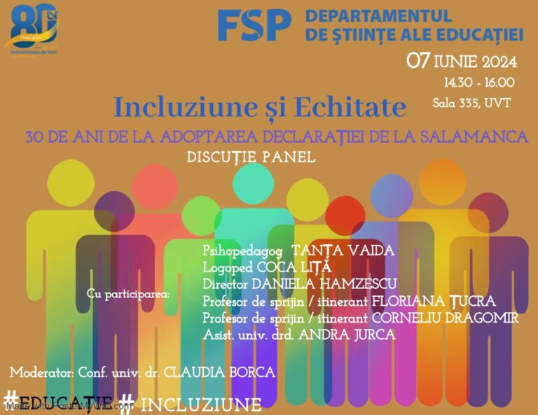 Discuția Panel „Incluziune și Echitate”, organizată de Departamentul de Științe ale educației cu ocazia împlinirii a 30 de ani de la adoptarea Declarației de la Salamanca, și-a propus să analizeze împreună cu stakeholderii invitați ce a însemnat educația incluzivă în România ultimilor 30 de ani de la politici publice și direcții strategice la implementarea propriu-zisă, rezultate și provocări.