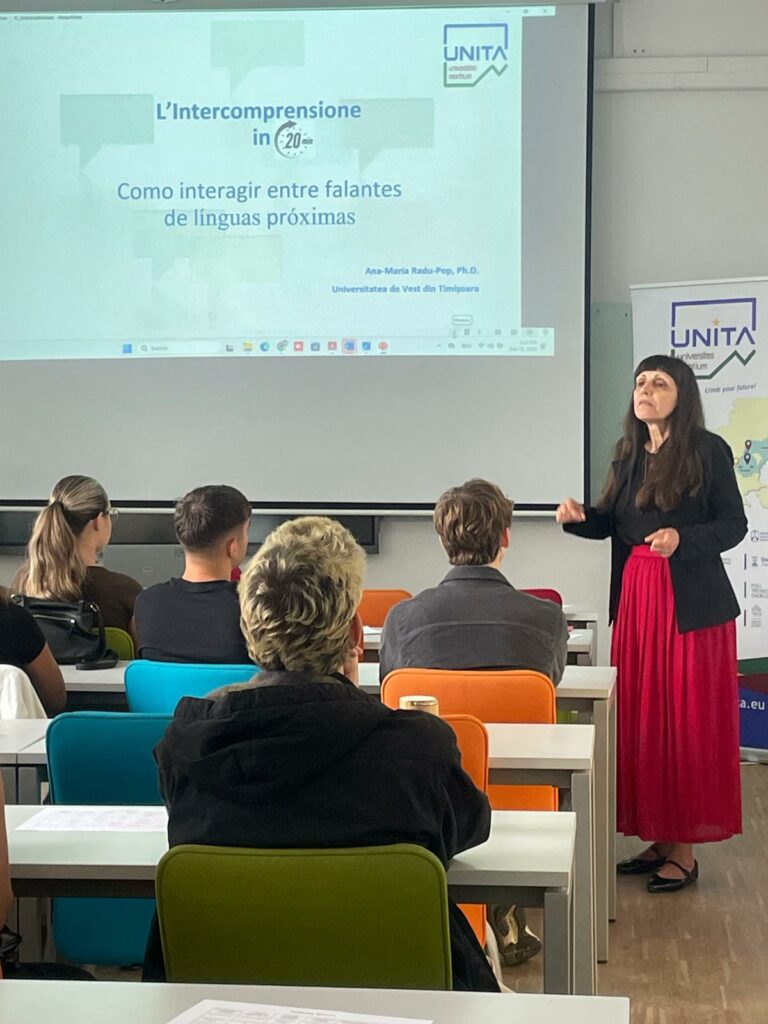 În perioada 22.09.2025-26.09.2025, la Universitatea de Vest din Timișoara s-au desfășurat trei sesiuni dedicate intercomprehensiunii în limbile romanice, susținute de conf. univ. dr. Ana-Maria Radu-Pop, cu un cuvânt de deschidere din partea doamnei conf. univ. dr. Valy Ceia, prorector al UVT. Activitățile s-au adresat atât studenților din anul I, în cadrul săptămânii de inițiere, cât și celor peste 50 de participanți la Adunarea Generală a UNITA Students Assembly, organizată la Timișoara.