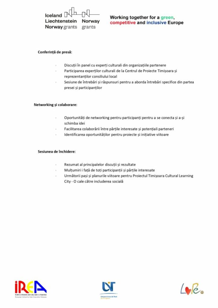 Întâlnirea a făcut parte din proiectul „Timișoara Cultural Learning City – a path to social inclusion”, finanțat prin Granturile SEE în România si implementat de Institutul Român de Educație a Adulților (IREA) în calitate de promoter, în parteneriat cu Universitatea de Vest din Timișoara (UVT) și Forening for mikrointegrering (LoPe) Norvegia.
