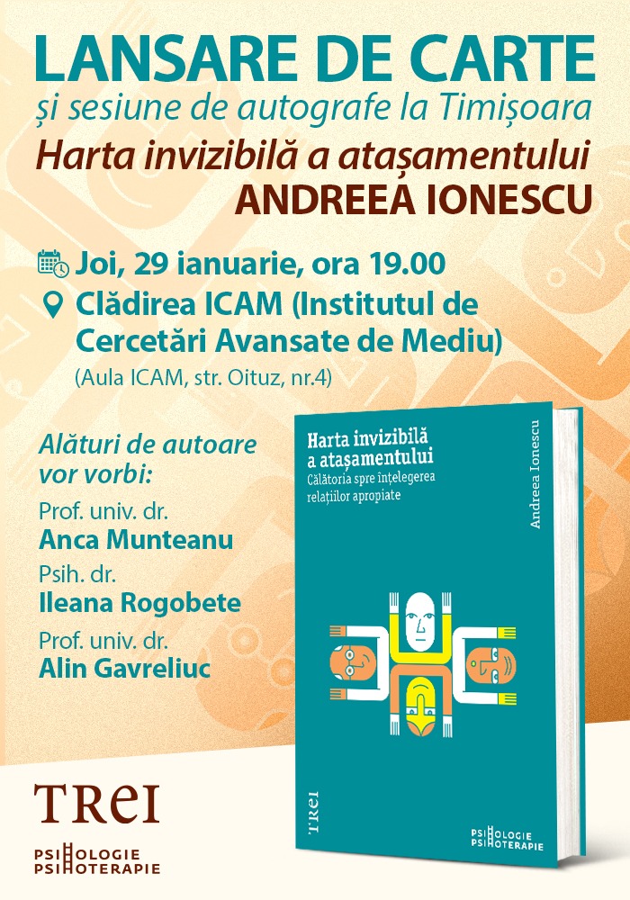 În data de 29 ianuarie, Aula ICAM a Universitatea de Vest din Timișoara a găzduit un eveniment academic de amploare, dedicat dezbaterii volumului Harta invizibilă a atașamentului. Călătoria spre înțelegerea relațiilor apropiate, semnat de Andreea Ionescu – psihoterapeut și fondator al clinicii de sănătate mentală ReCentre din Timișoara, partener de practică al UVT – apărut la finalul anului 2025 la Editura Trei. Interesul publicului a depășit așteptările organizatorilor: aproximativ 200 departicipanți– studenți, cadre didactice, psihologi, psihoterapeuți și membri ai comunității – au umplut până la refuz Aula ICAM, confirmând relevanța temei și impactul lucrării în spațiul academic și profesional românesc.